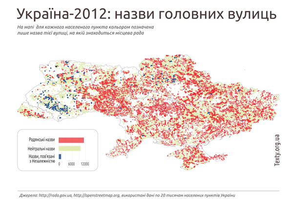 Дослідження назв центральних вулиць більшості населених пунктів України ТЕКСТИ провели у 2012 році. Навіть після перемоги Майдану ситуація кардинально не змінилася